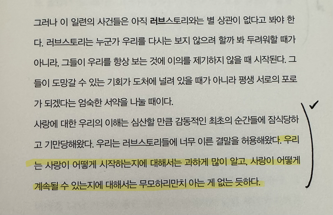 <낭만적 연애와 그 후의 일상>이 특히 좋았던 이유는, ‘사랑’을 바라보는 내 시야를 넓혀줬기 때문이야. 책에는 이런 문장이 나와 :